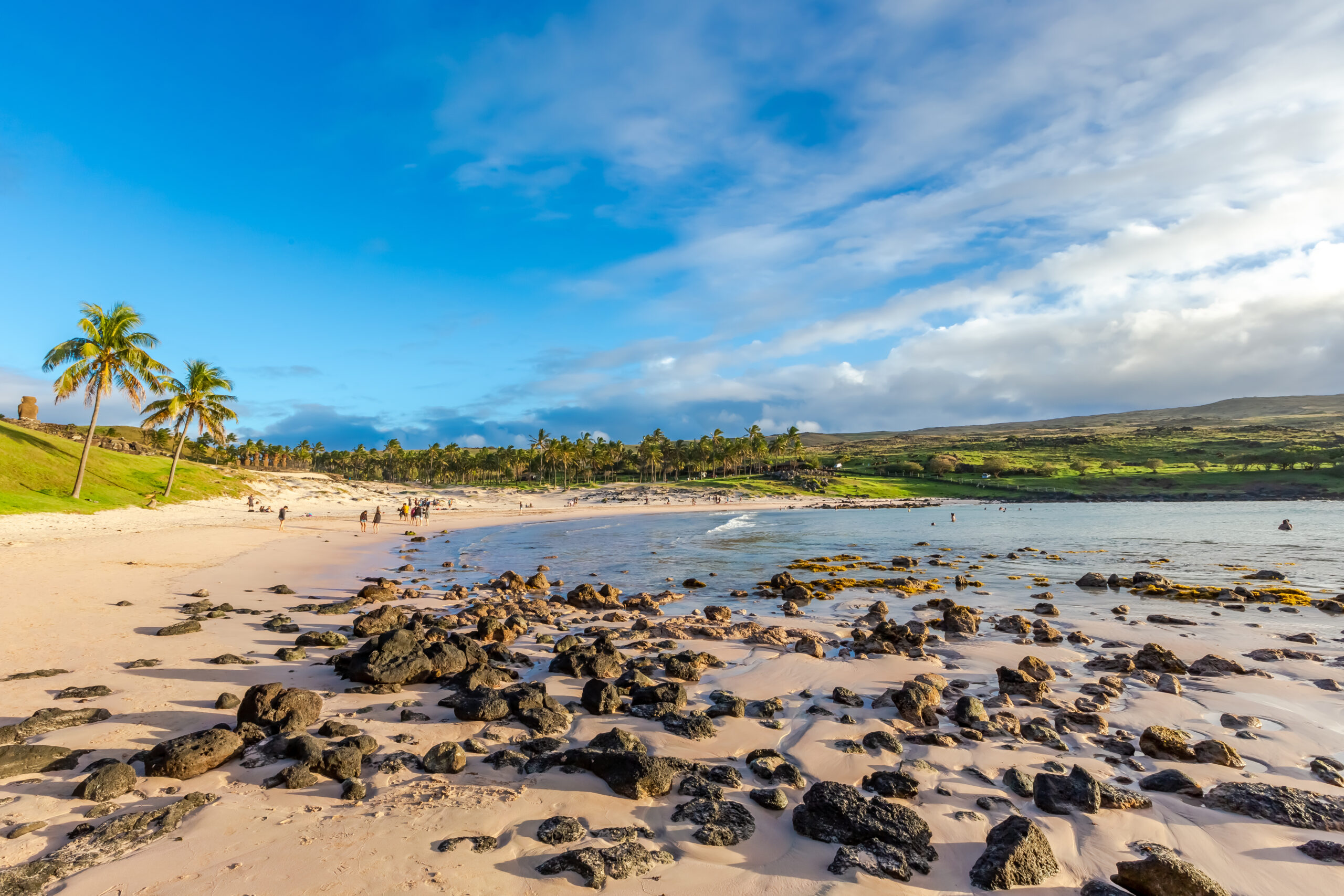 Pobřeží Velikonočního ostrova je téměř celé složeno z drsných sopečných skal, ale pro dvě písečné pláže – jednou z nich je Anakena, idylický záliv s mírnou, křišťálově čistou vodou lemovanou zlatým pískem. Hned za pláží jsou dvě samostatné ahu (kamenné plošiny, na kterých stojí moai), jedna složená ze šesti samostatných moai (soch) a druhá z jediné postavy. Několik malých stánků na pláži prodává občerstvení a nápoje.